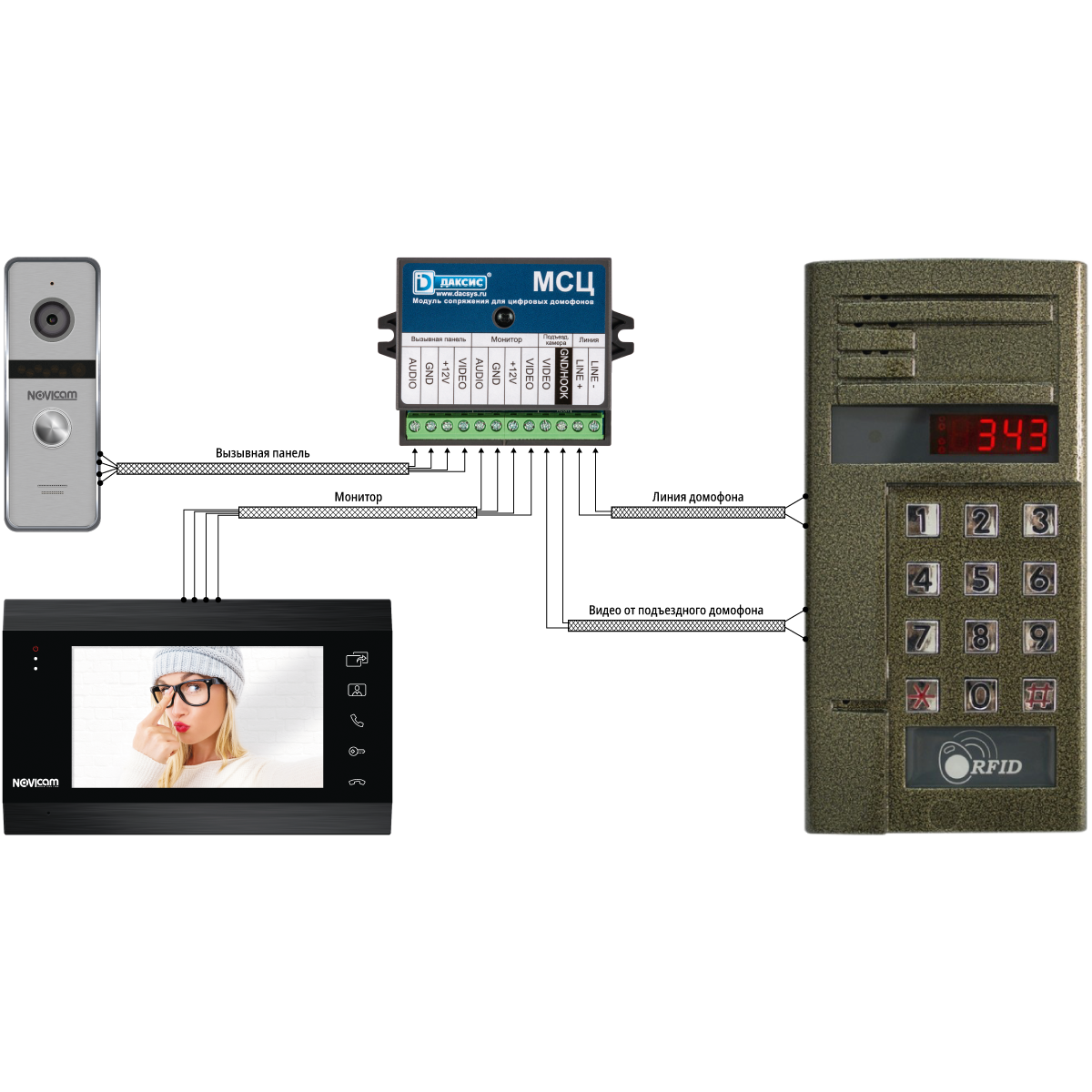 Помимо линии аудиодомофона с помощью модуля сопряжения можно подключить четырехпроводную вызывную видеопанель (для установки на этаж) и видеосигнал от подъездной видеокамеры.